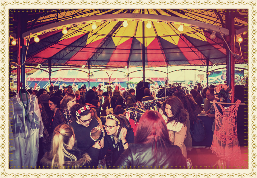 inmitten nostalgischer Jahrmarktbauten, selbstgezimmerter Sitzgelegenheiten